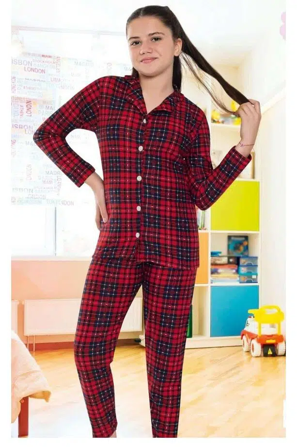 Etiketler | Miosse Kids Kız Çocuk Pamuklu Süet Kırmızı Ekose Desenli Gömlek Yaka Boydan Düğmeli Uzun Kollu Pijama Takımı M6591 |